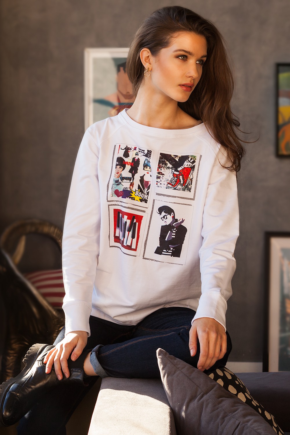 Хлопковый свитшот свободного покроя выполнен из футера. Спереди яркий принт в стиле винтажного комикса. Рукава-реглан, боковые швы со смещением. Манжеты, окантовка горловины и низ изделия из рибаны.