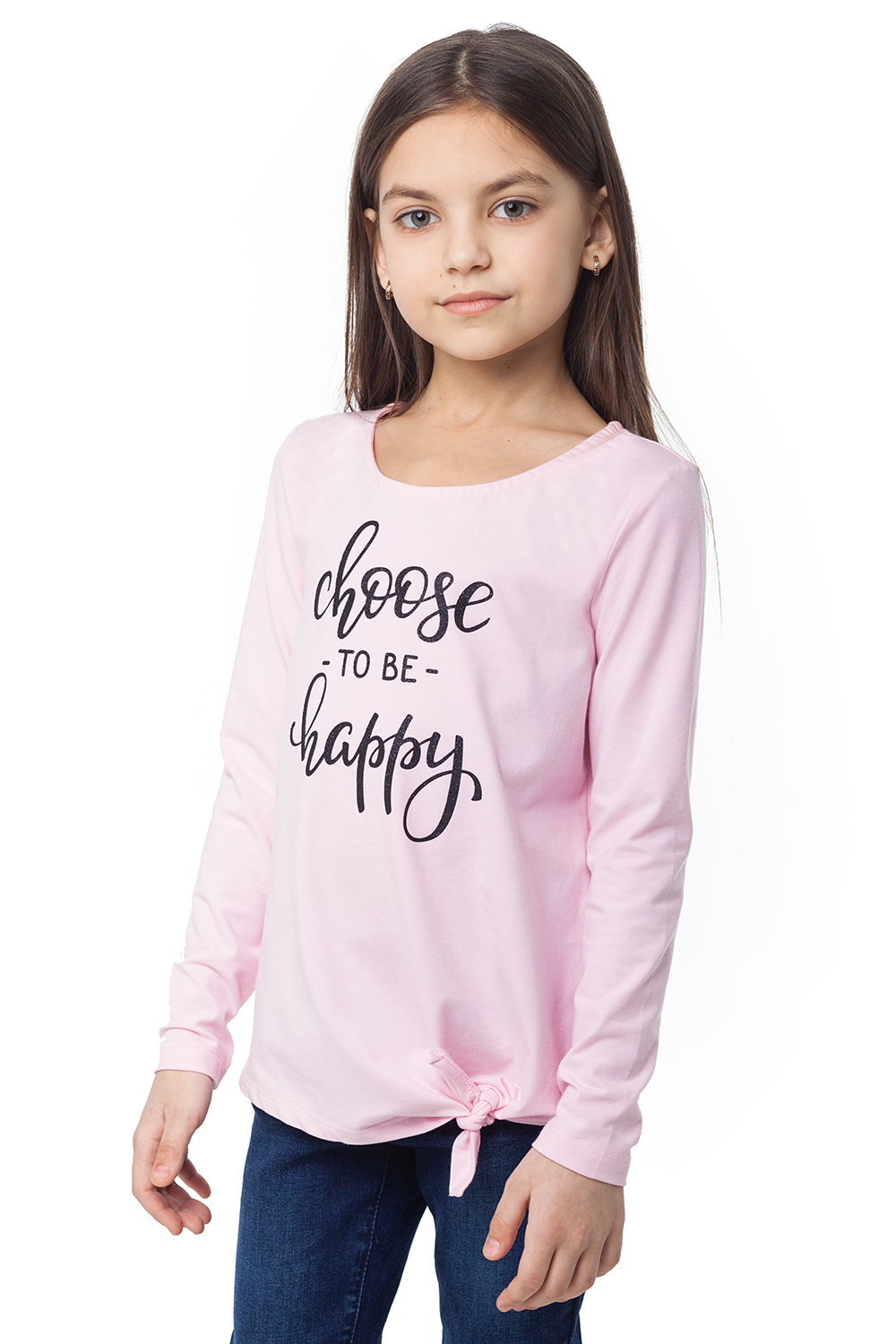 Лонгслив выполнен из эластичного хлопкового полотна с декоративной завязкой по низу. Модель декорирована принтом с глиттером и металлической нашивкой с логотипом на спинке.