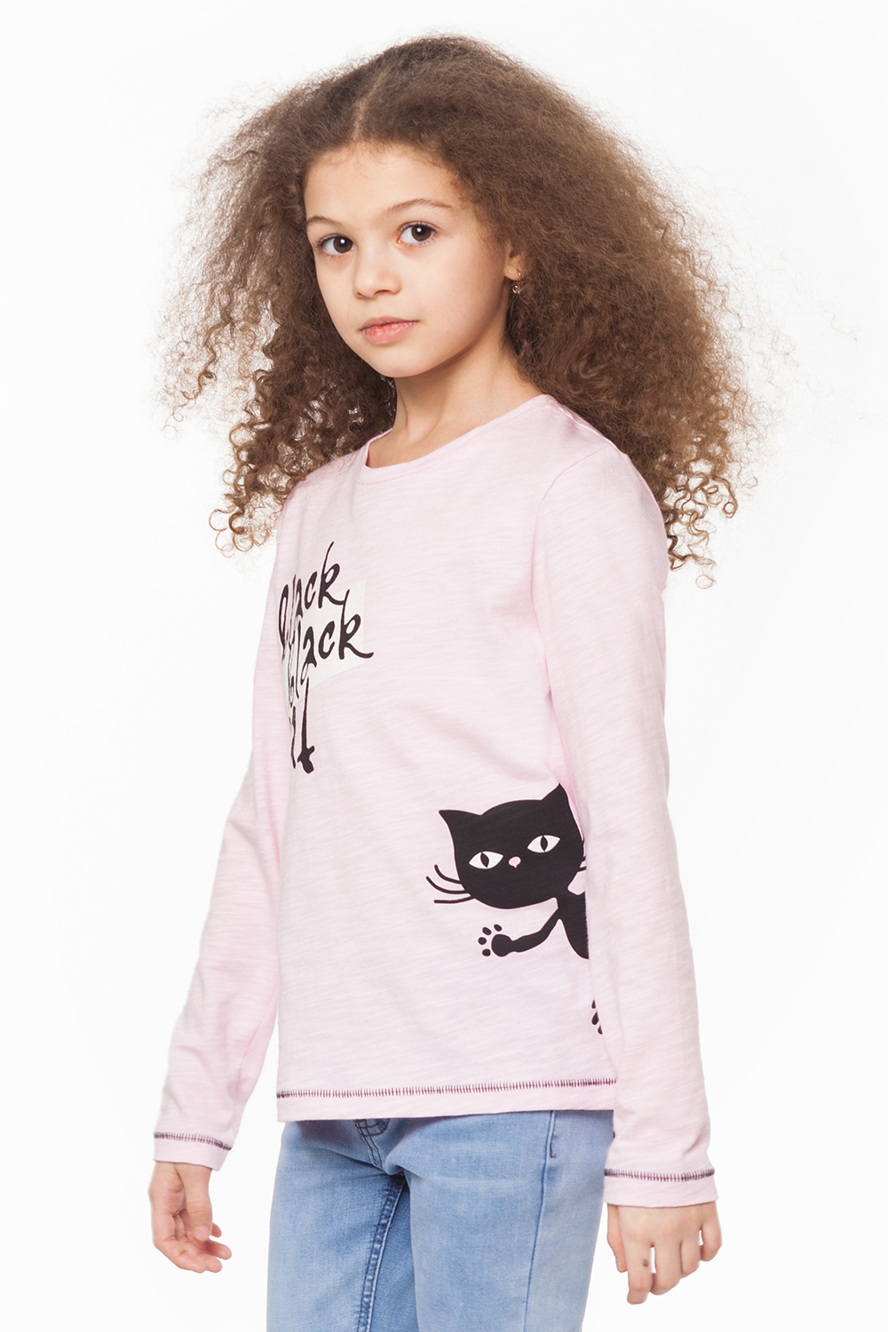Лонгслив выполнен из фактурного хлопкового полотна с декоративными отстрочками по низу изделия и рукавам. Спереди декоративный принт с мелким глиттером.