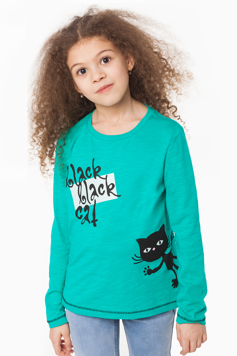 Лонгслив выполнен из фактурного хлопкового полотна с декоративными отстрочками по низу изделия и рукавам. Спереди декоративный принт с мелким глиттером.