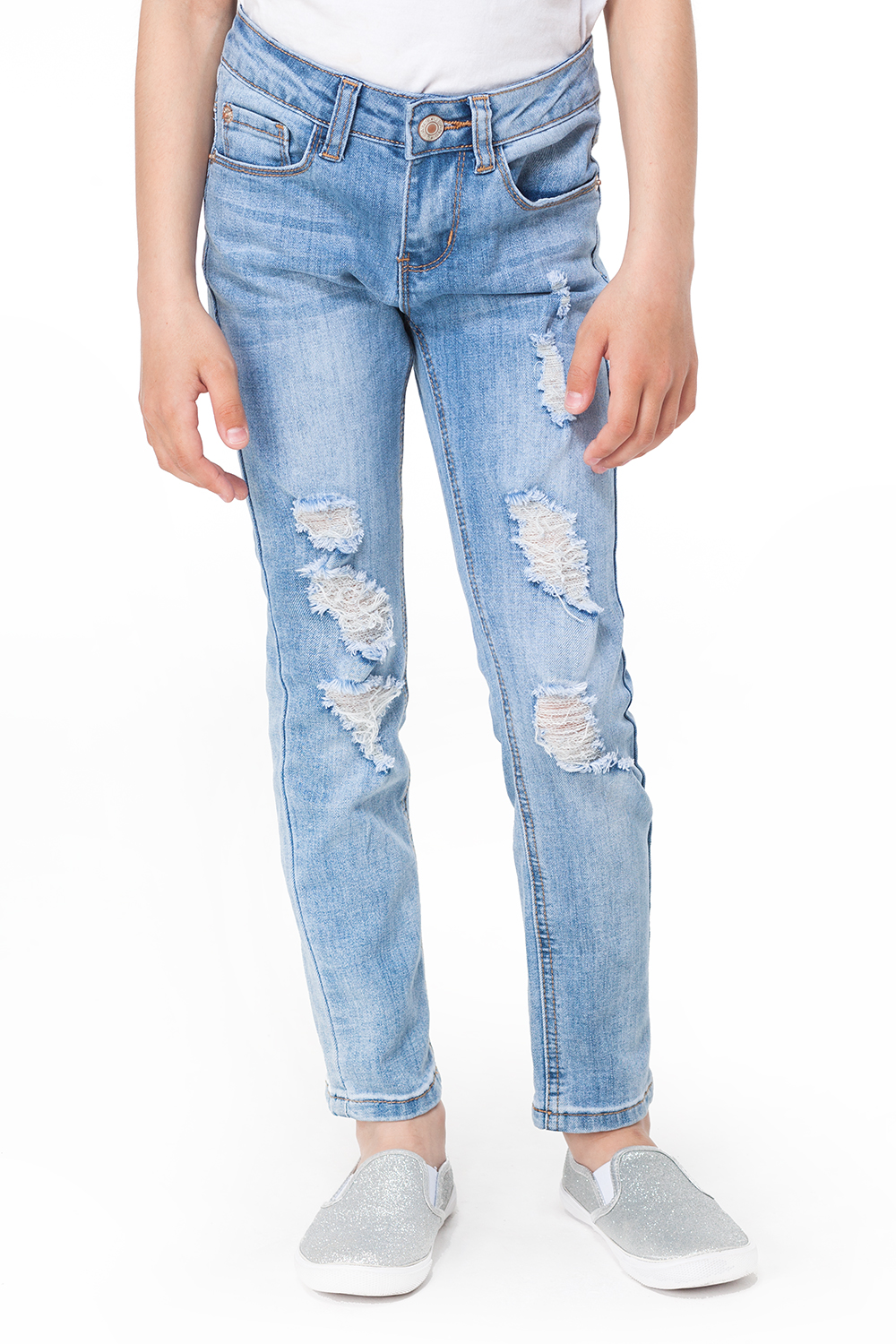 Джинсы выполнены из эластичного светло-синего денима со стиркой. Прямой свободный крой. Модель дополнена эффектными разрывами и потертостями.