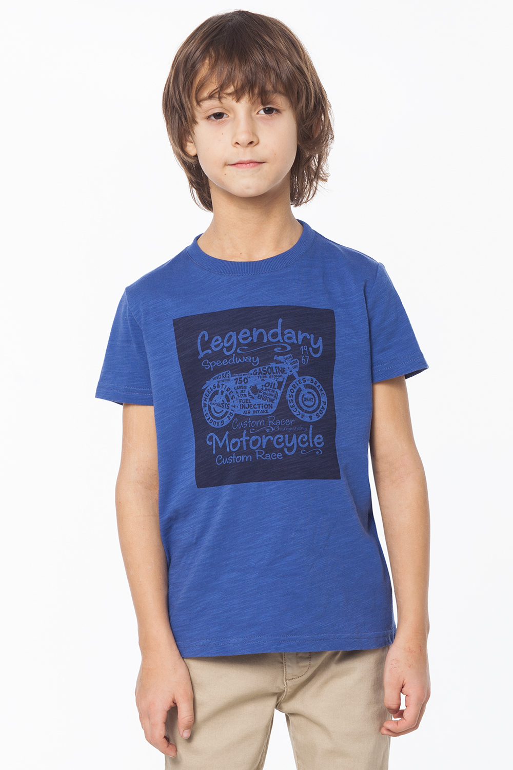 Футболка выполнена из фактурного полотна с обработкой горловины из рибаны. Спереди печатный принт и декоративная нашивка на рукаве.