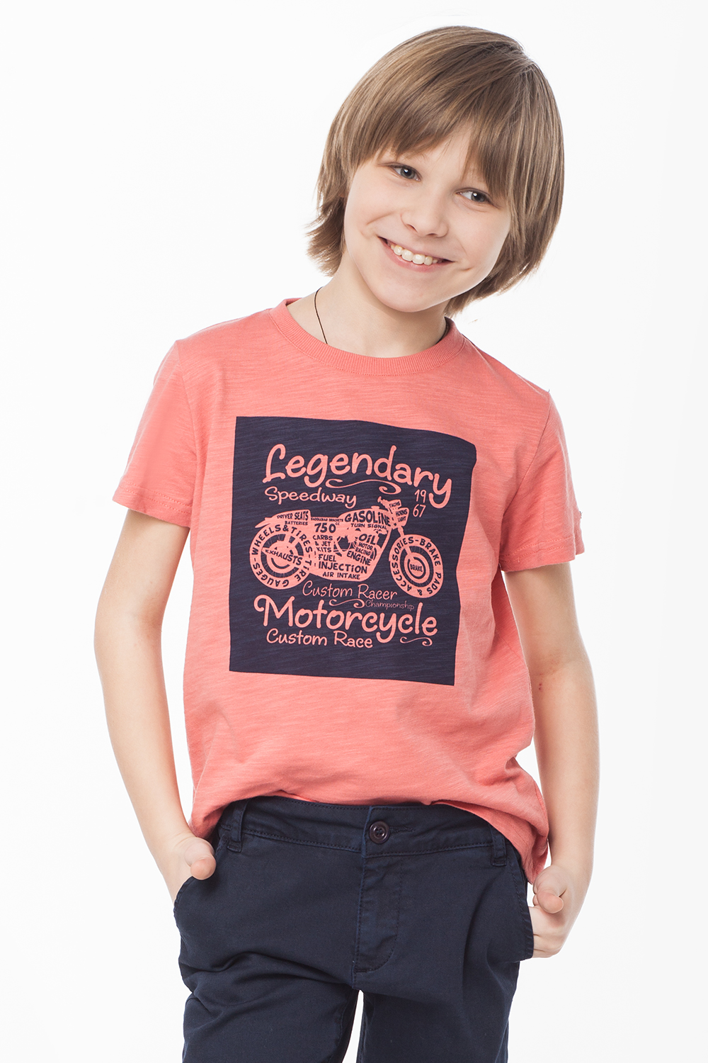 Футболка выполнена из фактурного полотна с обработкой горловины из рибаны. Спереди печатный принт и декоративная нашивка на рукаве.