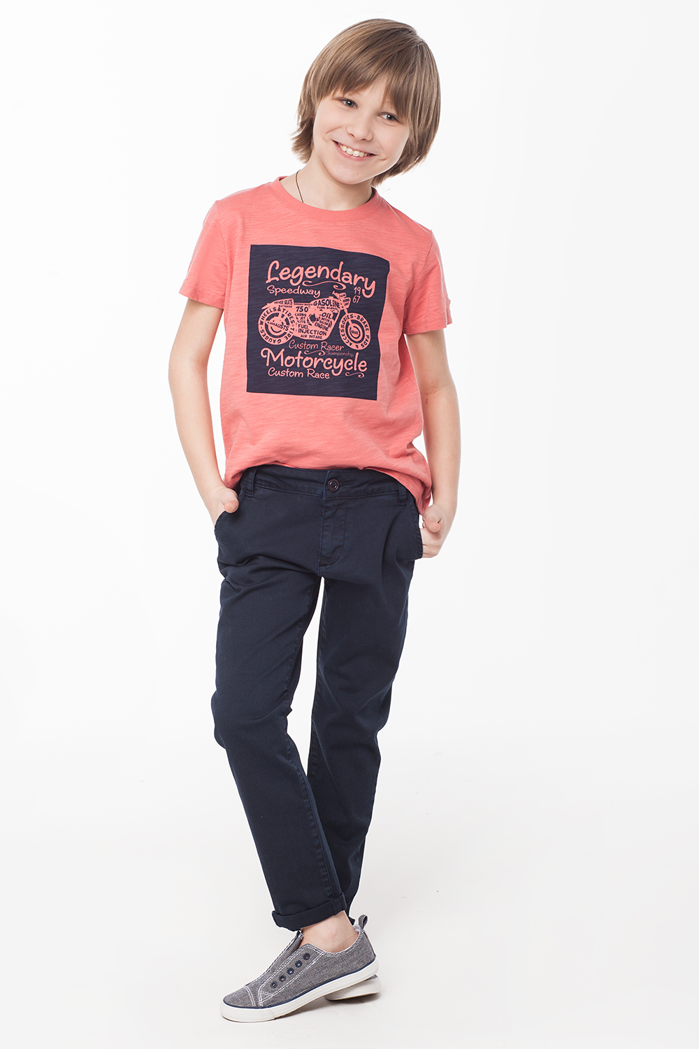 Брюки прямого кроя выполнены из эластичного хлопкового полотна. Низ изделия с отворотом.Спереди наклонные боковые карманы, сзади карманы-обманки с клапаном.
