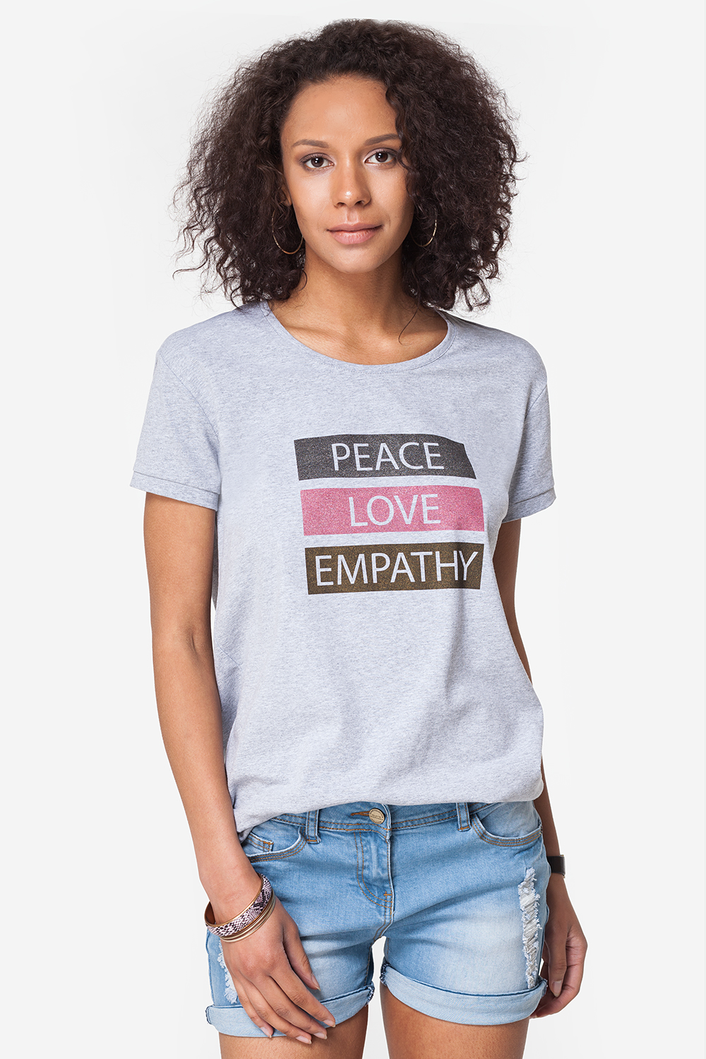 Удлиненная футболка свободного кроя выполнена из эластичного хлопкового полотна. Округлый вырез горловины, короткий втачной рукав с манжетой. Спереди декоративный печатный принт.