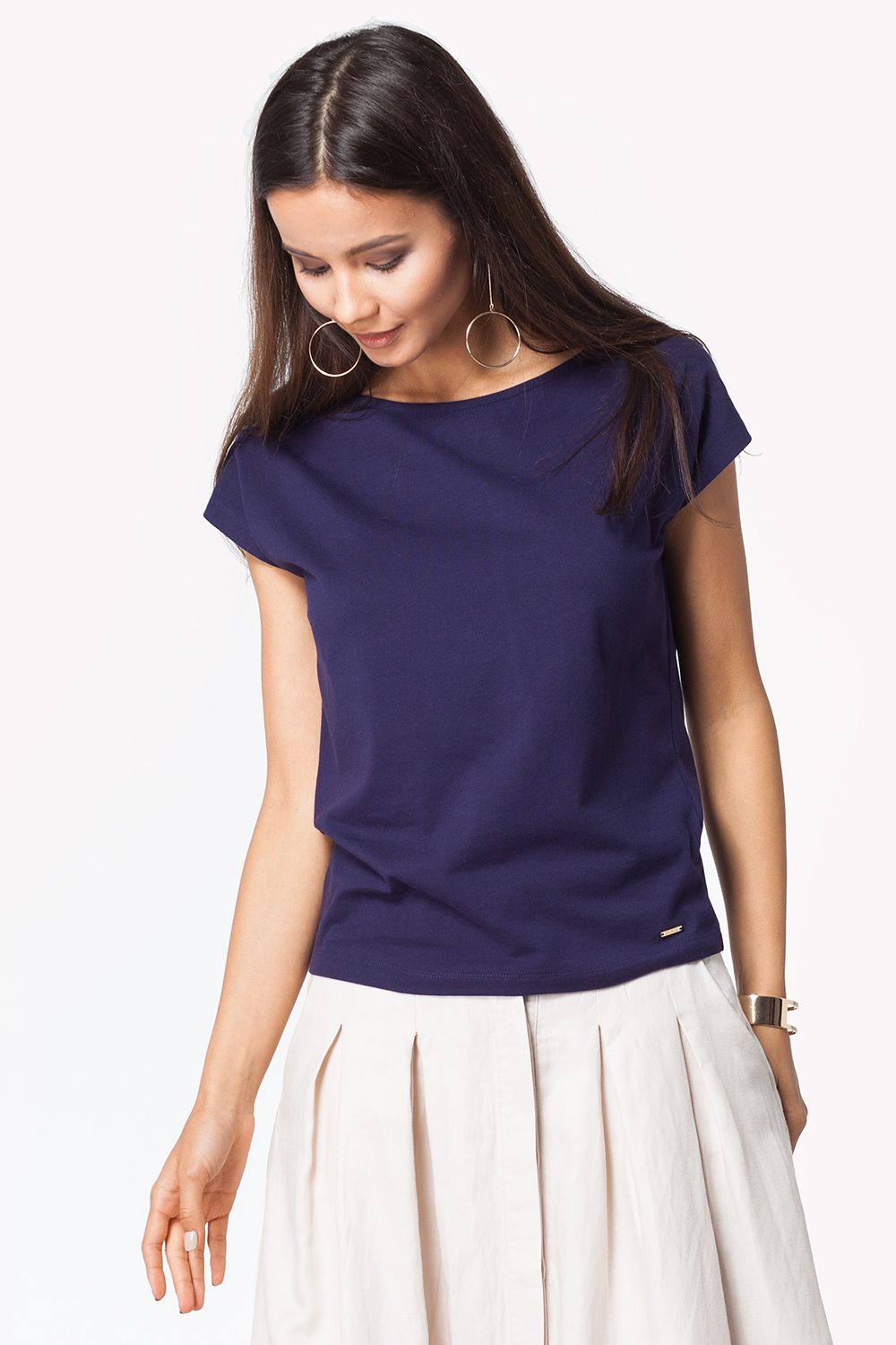 Футболка выполнена из эластичного хлопкового полотна. Спущенное плечо, горловина обработана обтачкой. Низ изделия дополнен металлической нашивкой с логотипом.