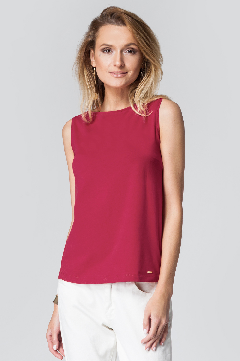 Базовый топ прямого силуэта выполнен из эластичного хлопкового полотна. Вырез горловины "лодочкой", спереди металлическая нашивка с логотипом.