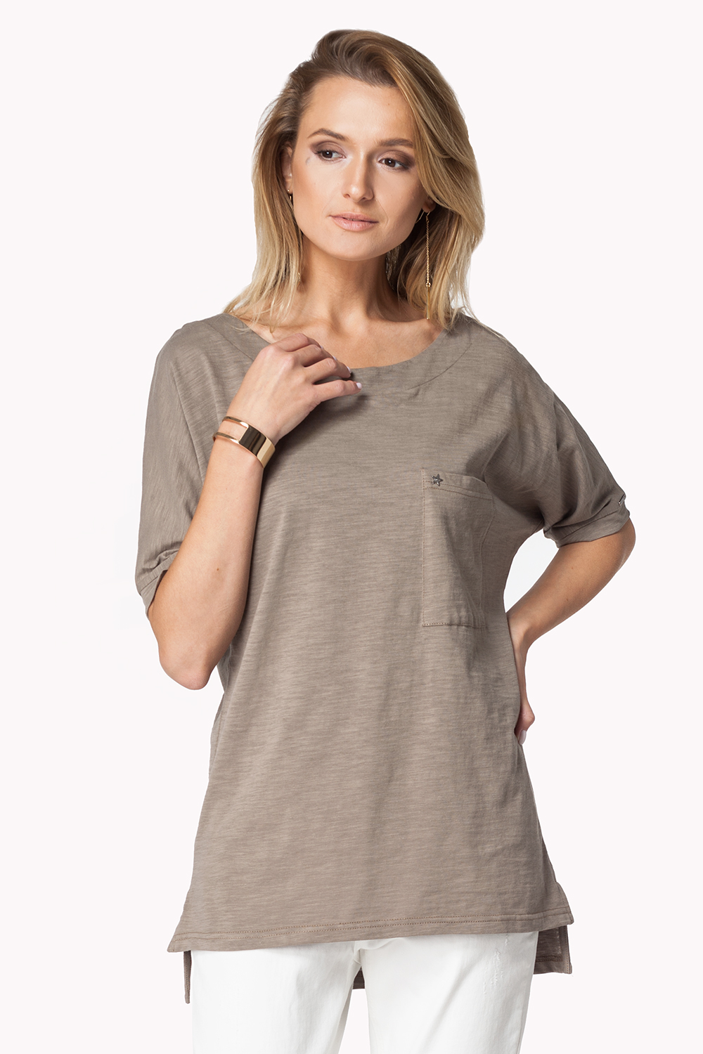 Футболка свободного удлиненного силуэта выполнена из фактурного хлопкового полотна. Модель с удлиненной спинкой и цельнокроеным рукавом с манжетой. Спинка дополнена треугольным вырезом и планкой с металлическими заклепками. Спереди накладной карман с мета