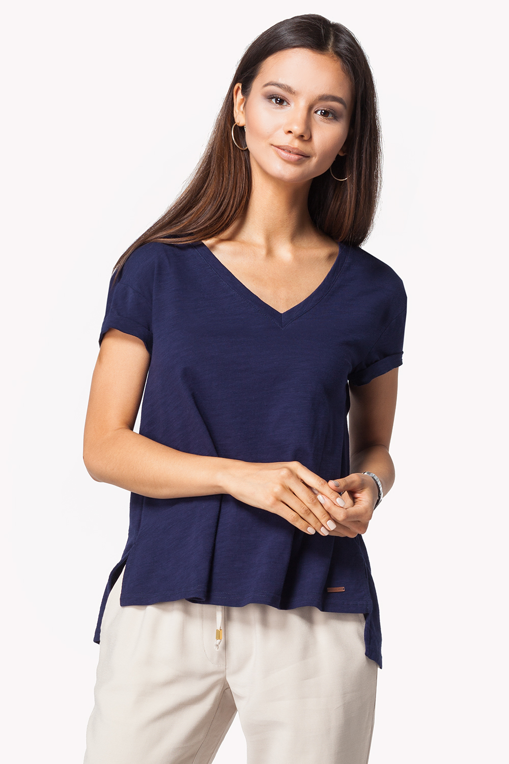 Хлопковая футболка свободного силуэта с глубоким V-образным вырезом и удлиненной спинкой. Модель выполнена из фактурного полотна, спереди декоративная нашивка из кож.зама.