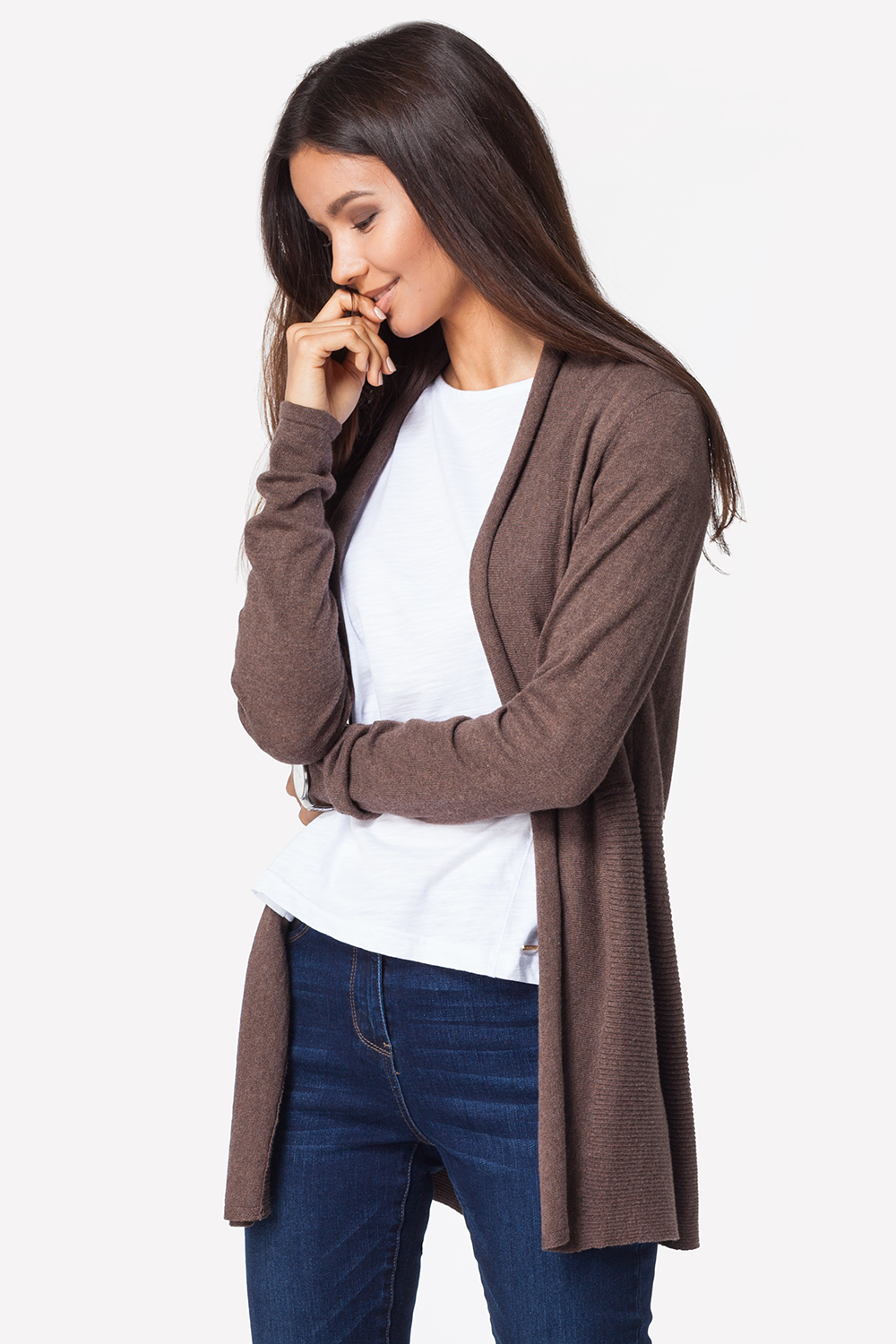 Удлинённый жакет выполнен из мягкой хлопковой пряжи. Нижняя часть с расклешением вязана резинкой.
