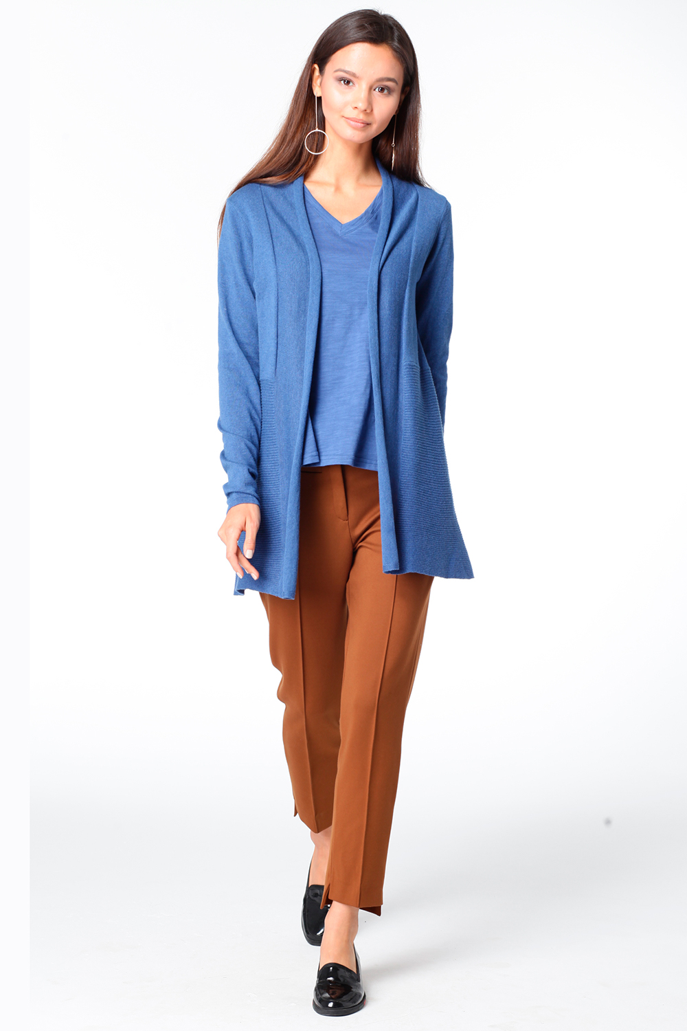 Удлинённый жакет выполнен из мягкой хлопковой пряжи. Нижняя часть с расклешением вязана резинкой.