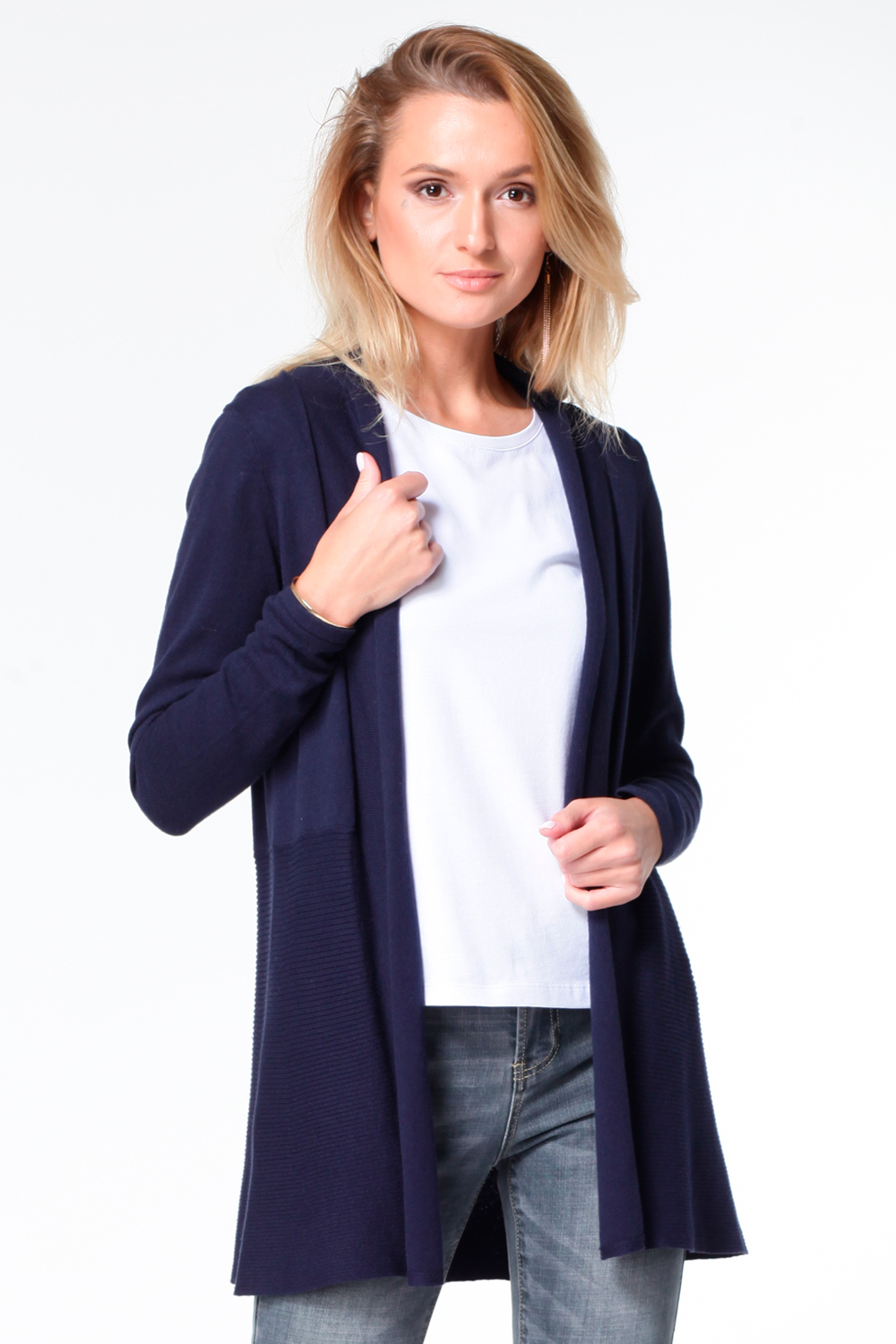 Удлинённый жакет выполнен из мягкой хлопковой пряжи. Нижняя часть с расклешением вязана резинкой.