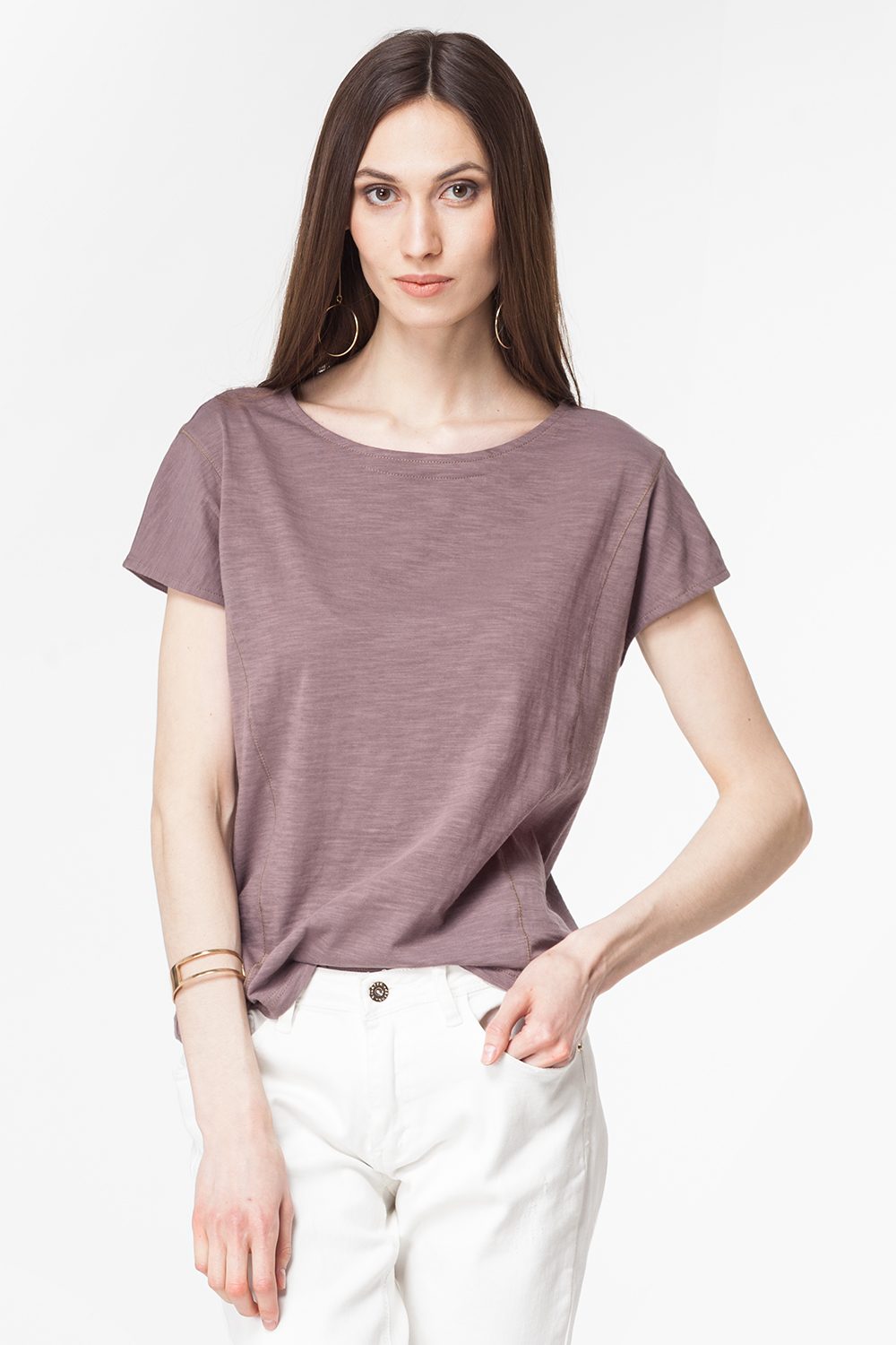 Футболка свободного силуэта выполнена из фактурного хлопкового полотна. Модель со спущенным плечом и декоративными рельефами. Низ изделия дополнен металлической нашивкой с логотипом.