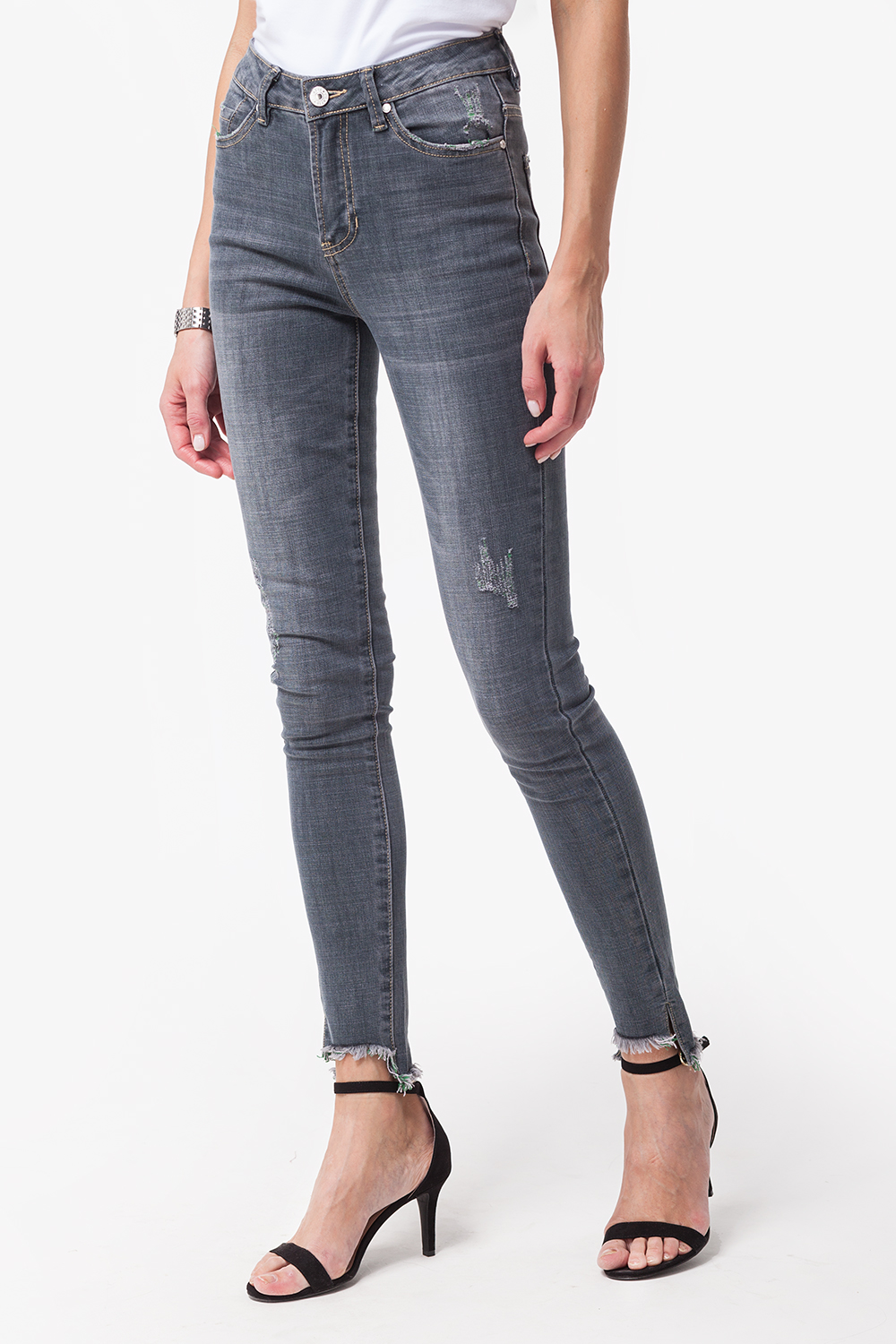 Джинсы-скинни с эффектом потертости выполнены из эластичного денима. Модель с высокой посадкой и ассиметричным необработанным нижним краем. Декоративные разрывы эффектно подчеркнуты переплетением контрастных нитей с изнаночной стороны.
