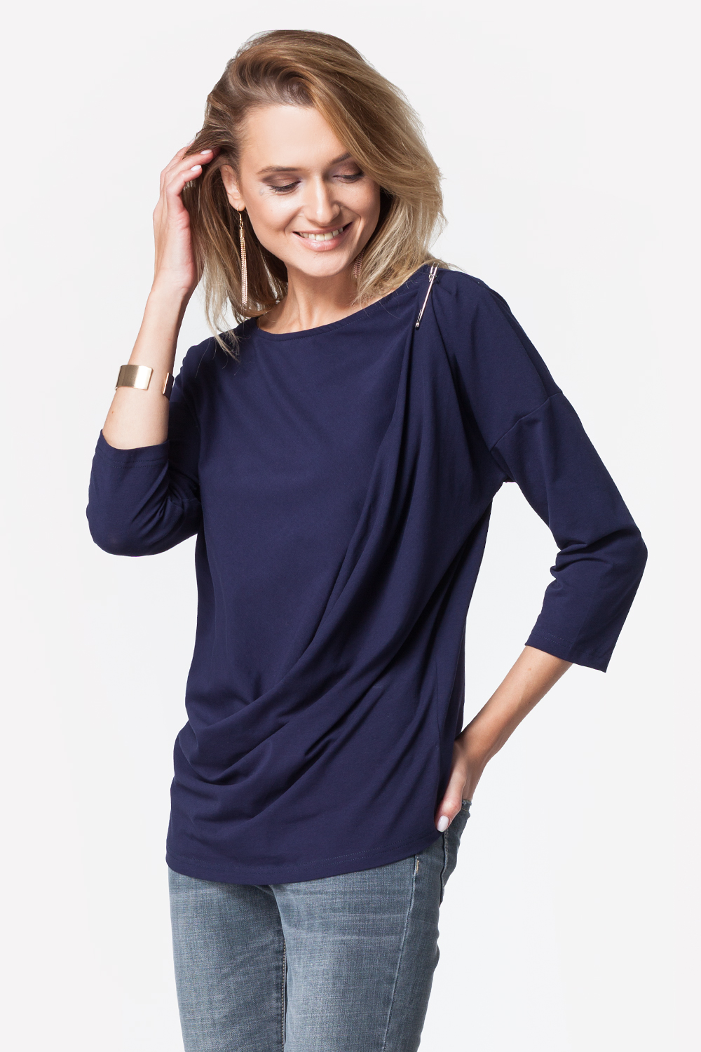 Футболка свободного кроя с заужением к низу выполнена из эластичного хлопкового полотна. Спереди складка от плеча создает эффектную драпировку. Рукав 3/4, на спинке металлическая нашивка с логотипом. В комплекте декоративная заколка-булавка.
