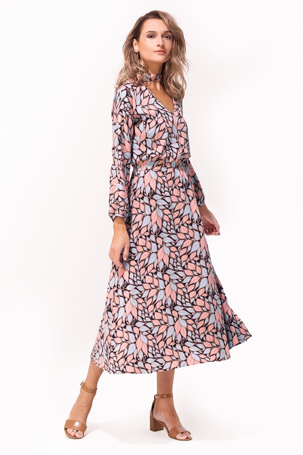 Платье-миди выполнено из штапельной вискозы с растительным принтом. Свободный силуэт с широкой расклешенной юбкой, талия собрана на резинку. Модель с трендовым сочетанием глубоких V-образных вырезов и воротника-стойки с завязками на бант.