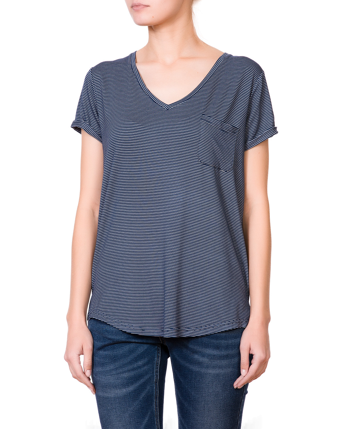 Футболка женская прямого силуэта с глубоким V-образным вырезом горловины и коротким рукавом, с нагрудным накладным карманом на полочке.